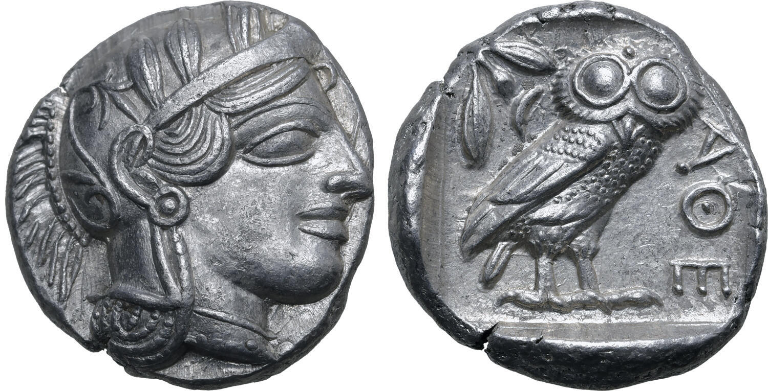 Attica, Athens AR Tetradrachm. Circa 454-404 BC. Head of Athena to right, wearing crested Attic helmet ornamented with three olive leaves above visor and spiral palmette on bowl, round earring with central boss, and pearl necklace / Owl standing to right with head facing; olive sprig and crescent behind, ??? before; all within incuse square. Kroll 8; Dewing 1591-8; SNG Copenhagen 31; HGC 4, 1597. 17.20g, 24mm, 6h.Good Extremely Fine; highly lustrous metal.