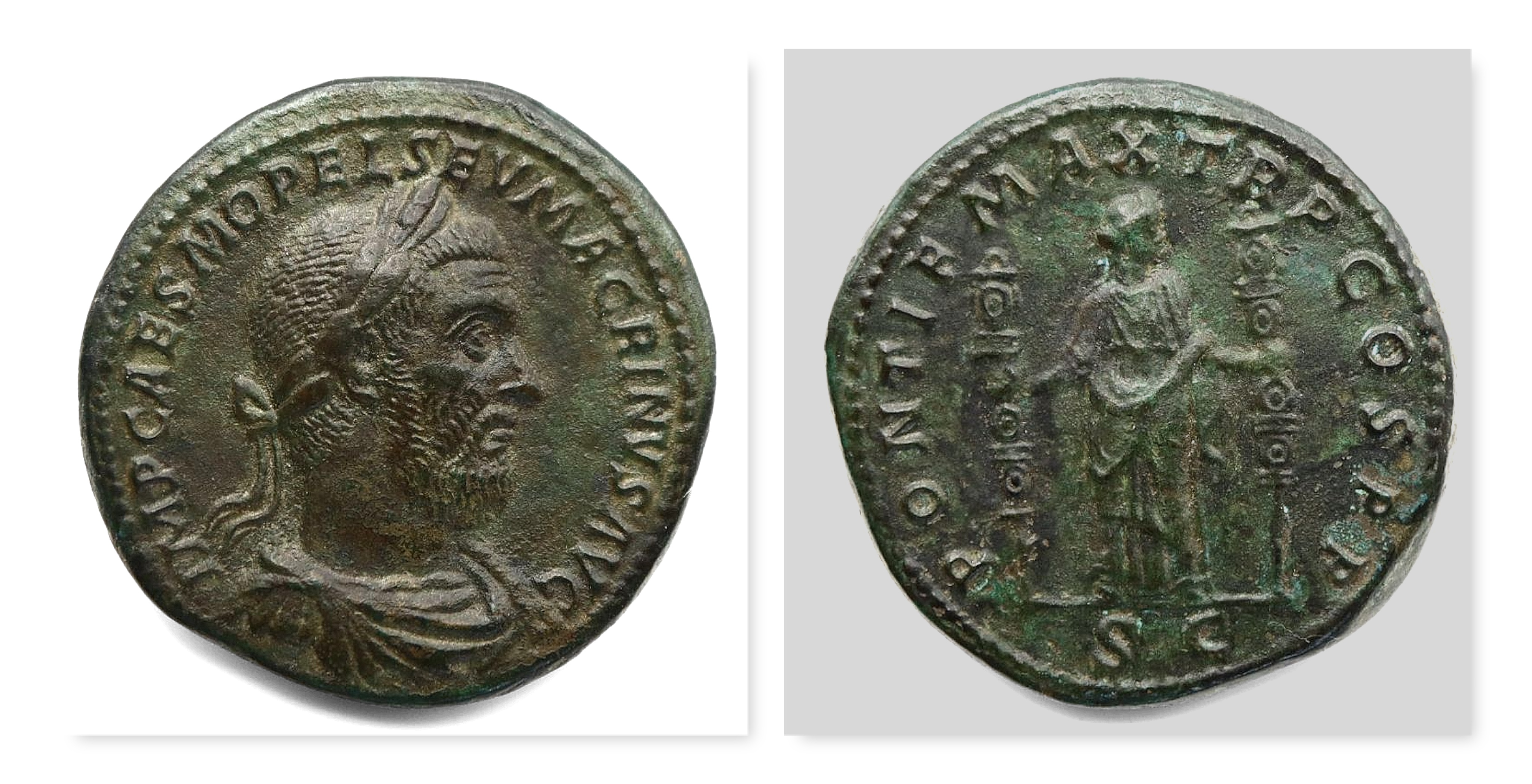 Macrinus, 217-218. Sestertius, 31 mm, 22.78 g, Rome, summer 217-early 218. IMP CAES M OPEL SEV MACRINVS AVG Laureate and cuirassed bust of Macrinus to right. Rev. FIDES MILITVM / S C Fides standing front, head to right, placing her right foot on helmet and holding standard in each hand. BMC p. 524 †. Clay Issue 2. Cohen 24. RIC 180. Rare. Tooled and smoothed , otherwise, extremily fine. Dark green patina.
